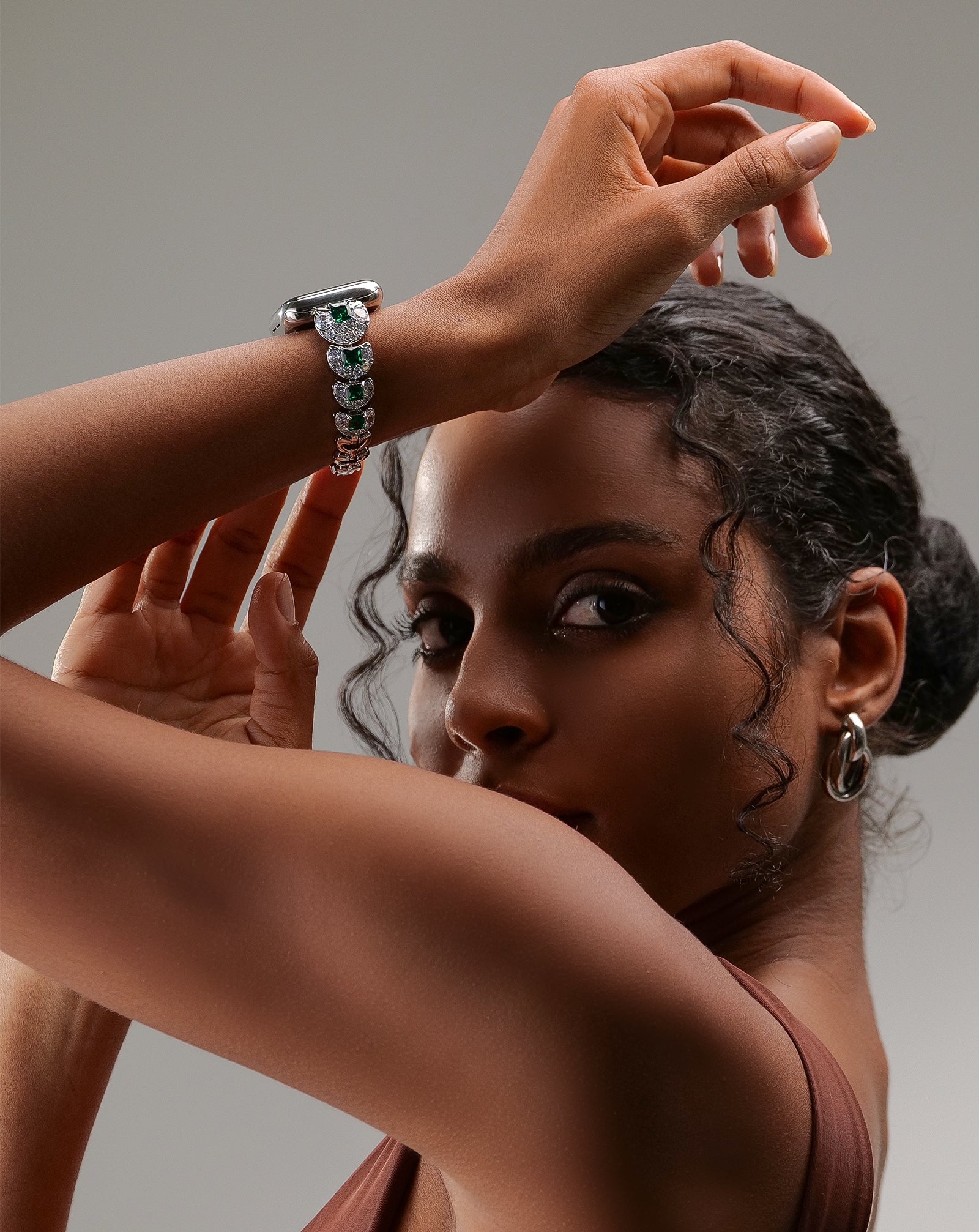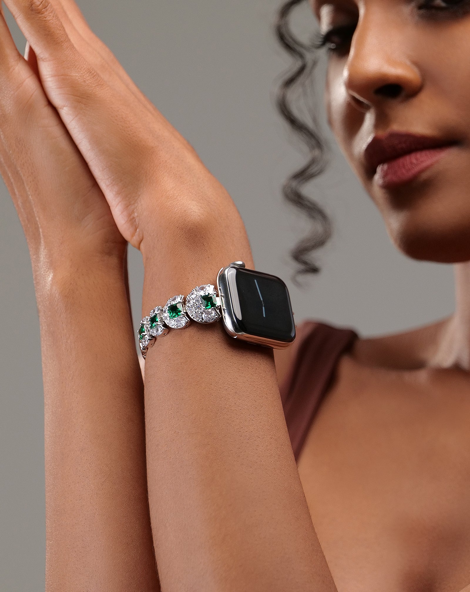This Art Deco Apple Watch strap, featuring lab-grown gems, balances classic and youthful vibes, ideal for high-end events. Emerald zirconia complements shimmering gowns, boasting diamond-grade sparkle and emerald depth—luxury within reach.