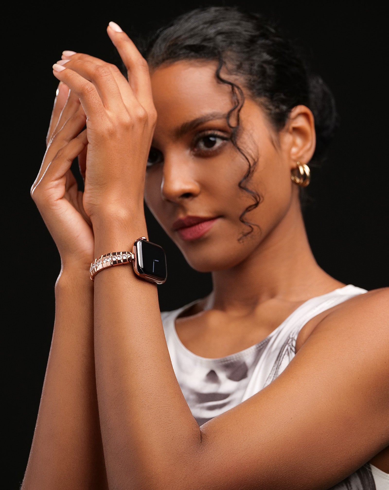 This Apple Watch band collection features a central diamond and a serpentine shape across designs. This women watch strap series blends vintage charm with modern edge, fitting diverse styles.